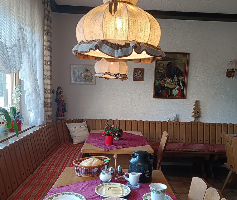 Im Frühstückszimmer erwartet Sie ein kleines Buffet mit regionalen Produkten. Heißgetränke servieren wir Ihnen persönlich an den Platz.